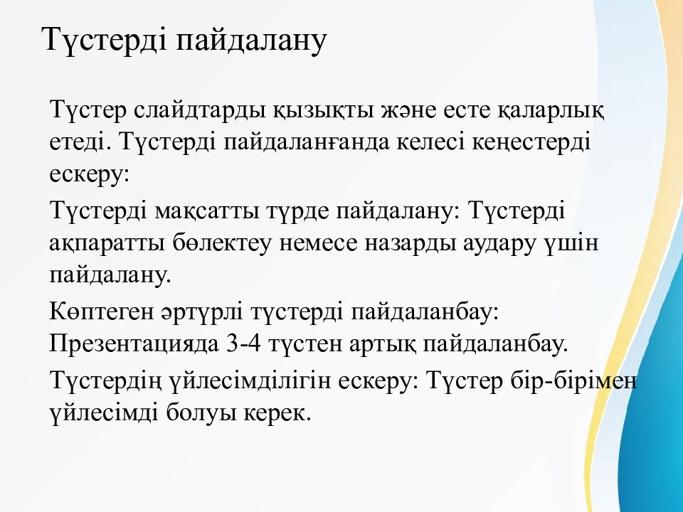 Түстер слайдтарды қызықты және есте қаларлық етеді. Түстерді пайдаланғанда келесі кеңестерді ескер у : Түстерді мақсатты түрде пайдалан у : Түстерді ақпаратты бөлектеу немесе назарды аудару үшін пайдалан у. Көптеген әртүрлі түстерді пайдаланба у : Презентацияда 3-4 түстен артық пайдаланба у. Түстердің үйлесімділігін ескер у : Түстер бір - бірімен үйлесімді болуы керек.