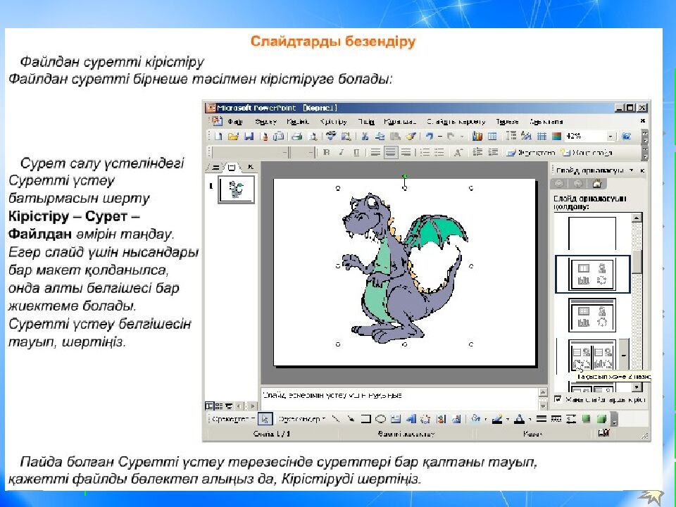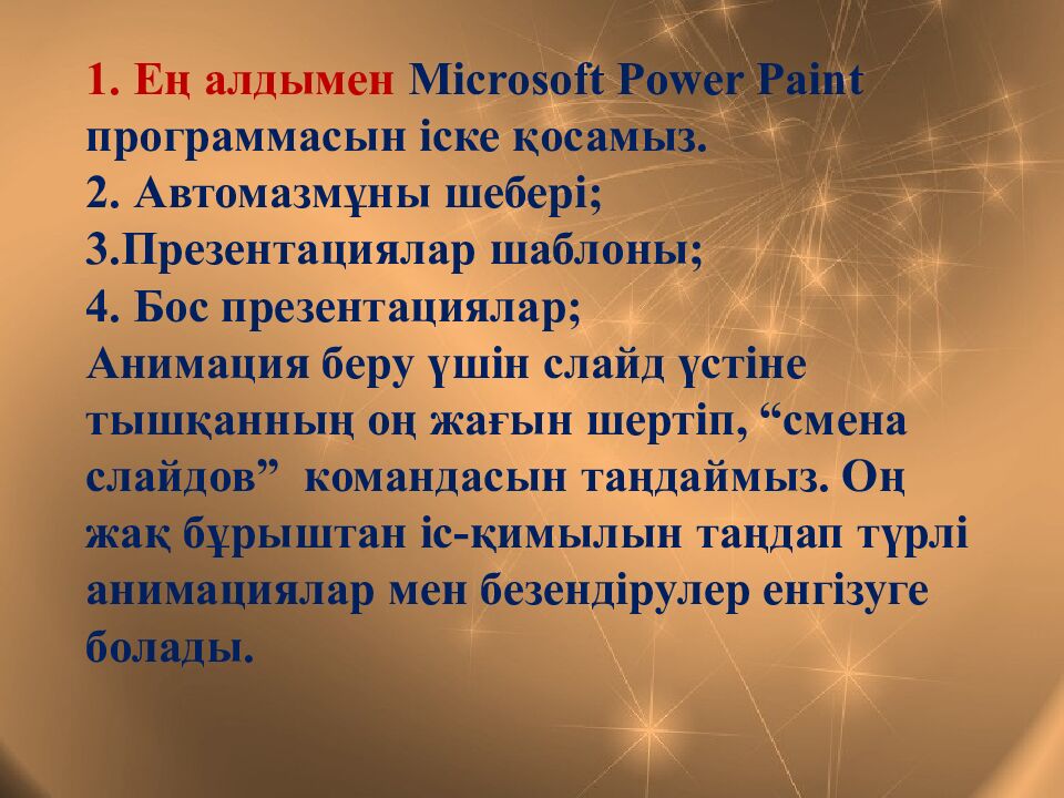 1. Ең алдымен Microsoft Pоwer Paint программасын іске қосамыз. 2. Автомазмұны шебері; 3.Презентациялар шаблоны; 4. Бос презентациялар; Анимация беру үшін слайд үстіне тышқанның оң жағын шертіп, “смена слайдов” командасын таңдаймыз. Оң жақ бұрыштан іс-қимылын таңдап түрлі анимациялар мен безендірулер енгізуге болады.