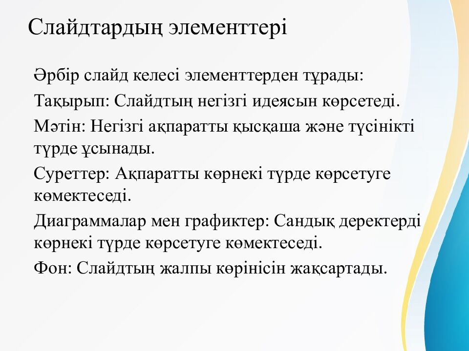 Әрбір слайд келесі элементтерден тұрады : Тақырып : Слайдтың негізгі идеясын көрсетеді. Мәтін : Негізгі ақпаратты қысқаша және түсінікті түрде ұсынады. Суреттер : Ақпаратты көрнекі түрде көрсетуге көмектеседі. Диаграммалар мен графиктер : Сандық деректерді көрнекі түрде көрсетуге көмектеседі. Фон : Слайдтың жалпы көрінісін жақсартады.