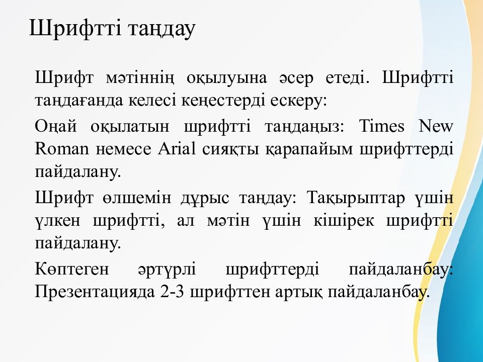 Шрифт мәтіннің оқылуына әсер етеді. Шрифтті таңдағанда келесі кеңестерді ескер у : Оңай оқылатын шрифтті таңдаңыз : Times New Roman немесе Arial сияқты қарапайым шрифттерді пайдалан у. Шрифт өлшемін дұрыс таңда у : Тақырыптар үшін үлкен шрифтті, ал мәтін үшін кішірек шрифтті пайдалан у. Көптеген әртүрлі шрифттерді пайдаланба у : Презентацияда 2-3 шрифттен артық пайдаланба у.