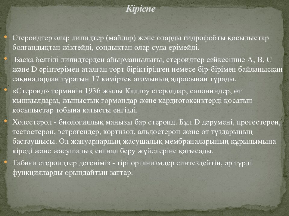 С тероидтер олар липидтер ( майлар ) және оларды гидрофобты қосылыстар болғандықтан жіктейді, сондықтан олар суда ерімейді. Басқа белгілі липидтерден айырмашылығы, стероидтер сәйкесінше A, B, C және D әріптерімен аталған төрт біріктірілген немесе бір-бірімен байланысқан сақиналардан тұратын 17 көміртек атомының ядросынан тұрады. «Стероид» терминін 1936 жылы Каллоу стеролдар, сапониндер, өт қышқылдары, жыныстық гормондар және кардиотоксиктерді қосатын қосылыстар тобына қатысты енгізді. Холестерол - биологиялық маңызы бар стероид. Бұл D дәрумені, прогестерон, тестостерон, эстрогендер, кортизол, альдостерон және өт тұздарының бастаушысы. Ол жануарлардың жасушалық мембраналарының құрылымына кіреді және жасушалық сигнал беру жүйелеріне қатысады. Табиғи стероидтер дегеніміз - тірі организмдер синтездейтін, әр түрлі функцияларды орындайтын заттар. Кіріспе