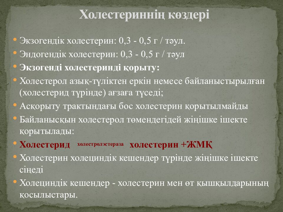 Экзогендік холестерин: 0,3 - 0,5 г / тәул. Эндогендік холестерин: 0,3 - 0,5 г / тәул Экзогенді холестеринді қорыту : Холестерол азық-түліктен еркін немесе байланыстырылған ( холестерид түрінде ) ағзаға түседі; Асқорыту трактындағы бос холестерин қорытылмайды Байланысқын холестерол төмендегідей жіңішке ішекте қорытылады: Холестерид холестролэстераза холестерин +ЖМҚ Холестерин холециндік кешендер түрінде жіңішке ішекте сіңеді Холециндік кешендер - холестерин мен өт қышқылдарының қосылыстары. Холестериннің көздері