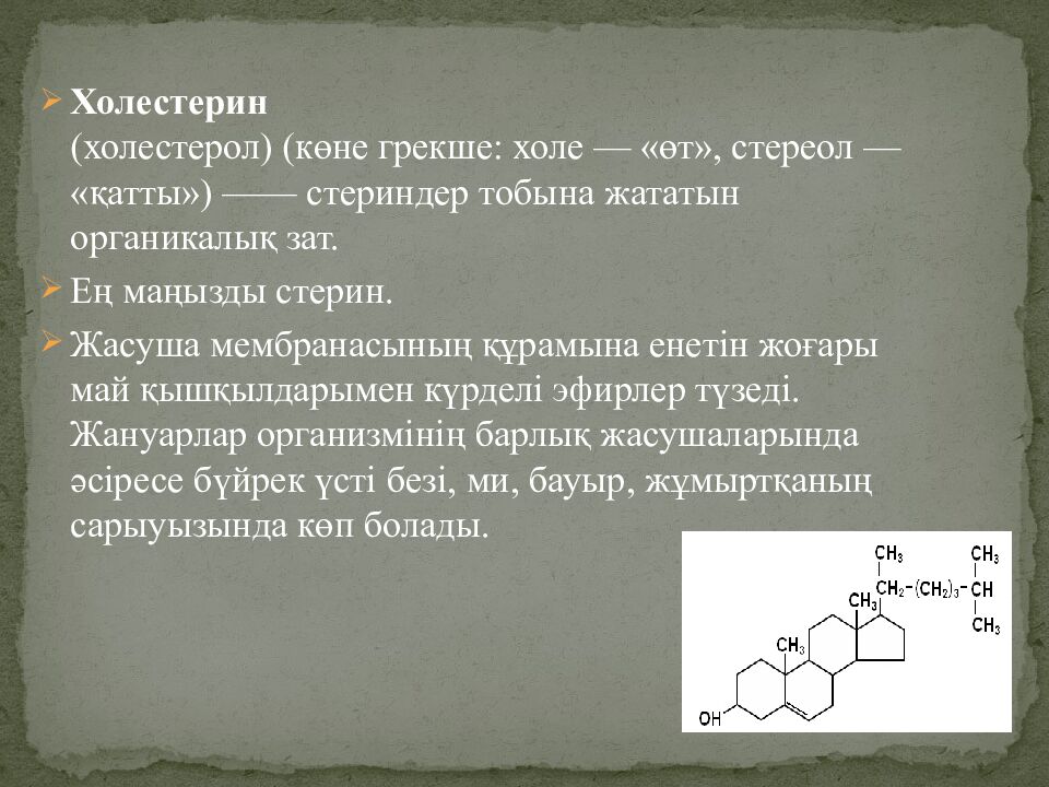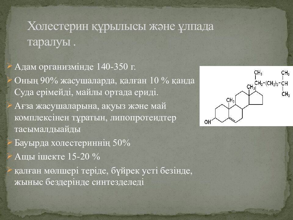 Слайд 10: Холестерин құрылысы және ұлпада таралуы