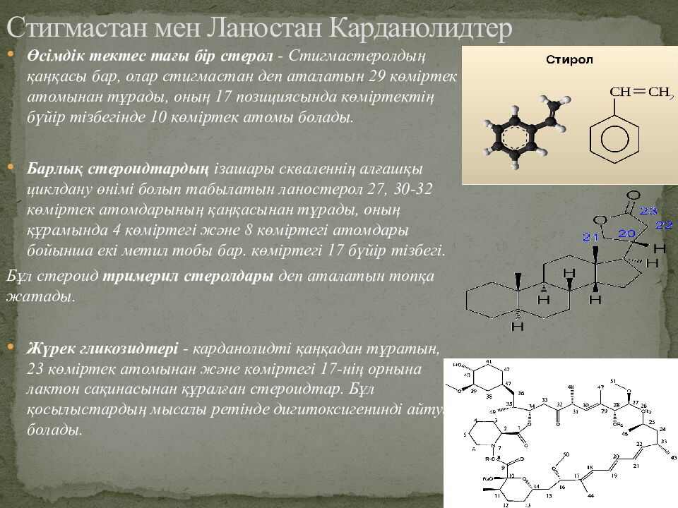 Өсімдік тектес тағы бір стерол - Стигмастеролдың қаңқасы бар, олар стигмастан деп аталатын 29 көміртек атомынан тұрады, оның 17 позициясында көміртектің бүйір тізбегінде 10 көміртек атомы болады. Барлық стероидтардың ізашары скваленнің алғашқы циклдану өнімі болып табылатын ланостерол 27, 30-32 көміртек атомдарының қаңқасынан тұрады, оның құрамында 4 көміртегі және 8 көміртегі атомдары бойынша екі метил тобы бар. көміртегі 17 бүйір тізбегі. Бұл стероид тримерил стеролдары деп аталатын топқа жатады. Жүрек гликозидтері - карданолидті қаңқадан тұратын, 23 көміртек атомынан және көміртегі 17-нің орнына лактон сақинасынан құралған стероидтар. Бұл қосылыстардың мысалы ретінде дигитоксигенинді айтуға болады. Стигмастан мен Ланостан Карданолидтер