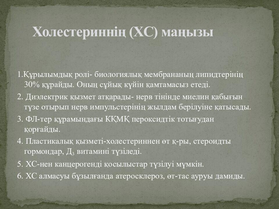 1.Құрылымдық ролі- биологиялық мембрананың липидтерінің 30% құрайды. Оның сұйық күйін қамтамасыз етеді. 2. Диэлектрик қызмет атқарады- нерв тінінде миелин қабығын түзе отырып нерв импульстерінің жылдам берілуіне қатысады. 3. ФЛ-тер құрамындағы КҚМҚ пероксидтік тотығудан қорғайды. 4. Пластикалық қызметі-холестериннен өт қ-ры, стероидты гормондар, Д 3 витамині түзіледі. 5. ХС-нен канцерогенді қосылыстар түзілуі мүмкін. 6. ХС алмасуы бұзылғанда атеросклероз, өт-тас ауруы дамиды. Холестериннің (ХС) маңызы