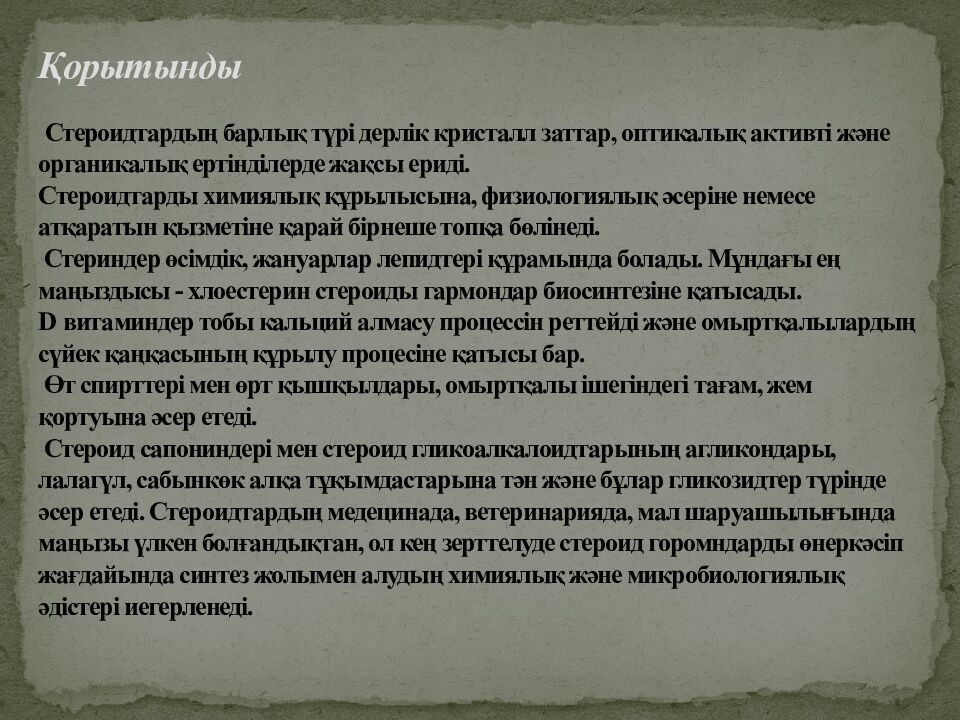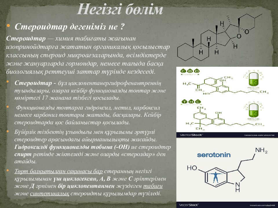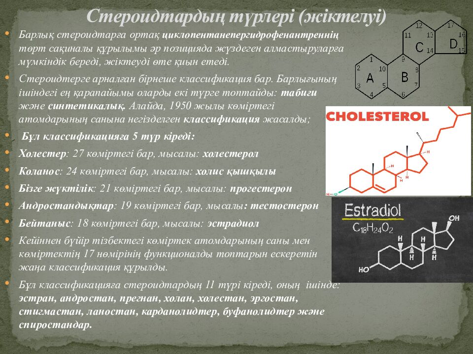 Стероидтар дегеніміз не ? Стероидтар — химия табиғаты жағынан изопринойдтарға жататын органикалық қосылыстар классының стероид микроағзаларында, өсімдіктерде және жануарларда гормондар, немесе тағыда басқа биологиялық реттеуші заттар түрінде кездеседі. Стероидтар - бұл циклопентанергидрофенантреннің туындылары, оларға кейбір функционалды топтар және көміртегі 17 жанама тізбегі қосылады. Функционалды топтарға гидроксил, метил, карбоксил немесе карбонил топтары жатады, басқалары. Кейбір стероидтарда қос байланыстар қосылады. Бүйірлік тізбектің ұзындығы мен құрылымы әртүрлі стероидтер арасындағы айырмашылықты жасайды. Гидроксилді функционалды тобына (- OH) ие стероидтер спирт ретінде жіктеледі және оларды « стеролдар » деп атайды. Төрт балқытылған сақинасы бар стеранның негізгі құрылымынан үш циклогексан, А, В және С әріптерімен және Д әрпімен бір циклопентанмен жүздеген табиғи және синтетикалық стероидты құрылымдар түзіледі. Негізгі бөлім