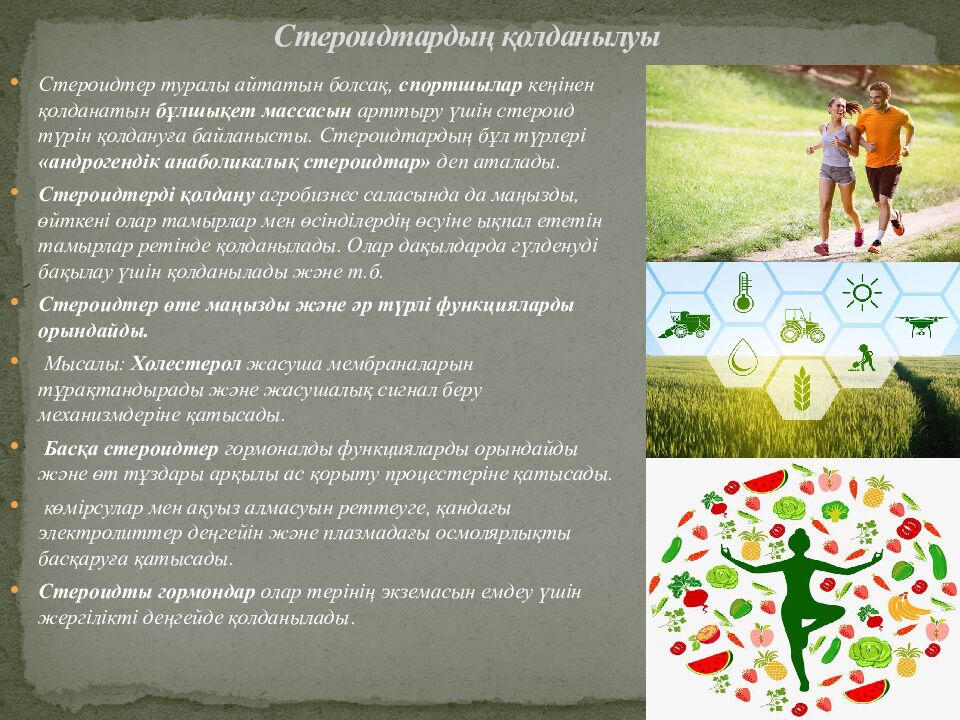 Стероидтер туралы айтатын болсақ, спортшылар кеңінен қолданатын бұлшықет массасын арттыру үшін стероид түрін қолдануға байланысты. Стероидтардың бұл түрлері « андрогендік анаболикалық стероидтар » деп аталады. Стероидтерді қолдану агробизнес саласында да маңызды, өйткені олар тамырлар мен өсінділердің өсуіне ықпал ететін тамырлар ретінде қолданылады. Олар дақылдарда гүлденуді бақылау үшін қолданылады және т.б. Стероидтер өте маңызды және әр түрлі функцияларды орындайды. Мысалы : Холестерол жасуша мембраналарын тұрақтандырады және жасушалық сигнал беру механизмдеріне қатысады. Басқа стероидтер гормоналды функцияларды орындайды және өт тұздары арқылы ас қорыту процестеріне қатысады. көмірсулар мен ақуыз алмасуын реттеуге, қандағы электролиттер деңгейін және плазмадағы осмолярлықты басқаруға қатысады. С тероидты гормондар олар терінің экземасын емдеу үшін жергілікті деңгейде қолданылады. Стероидтардың қолданылуы
