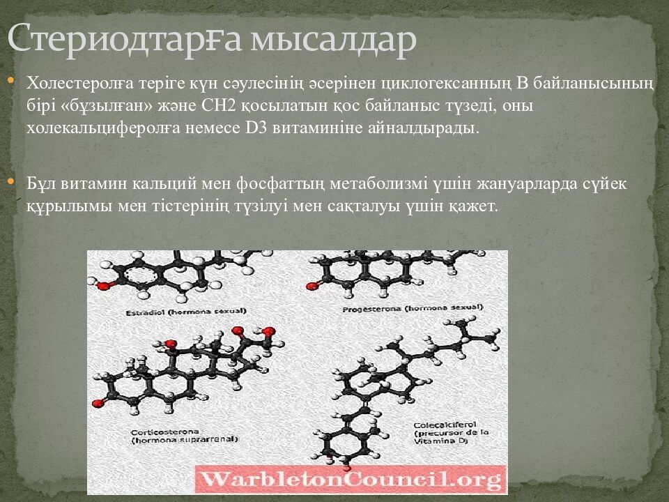 Холестеролға теріге күн сәулесінің әсерінен циклогексанның В байланысының бірі « бұзылған » және СН2 қосылатын қос байланыс түзеді, оны холекальциферолға немесе D3 витаминіне айналдырады. Бұл витамин кальций мен фосфаттың метаболизмі үшін жануарларда сүйек құрылымы мен тістерінің түзілуі мен сақталуы үшін қажет. Стериодтарға мысалдар