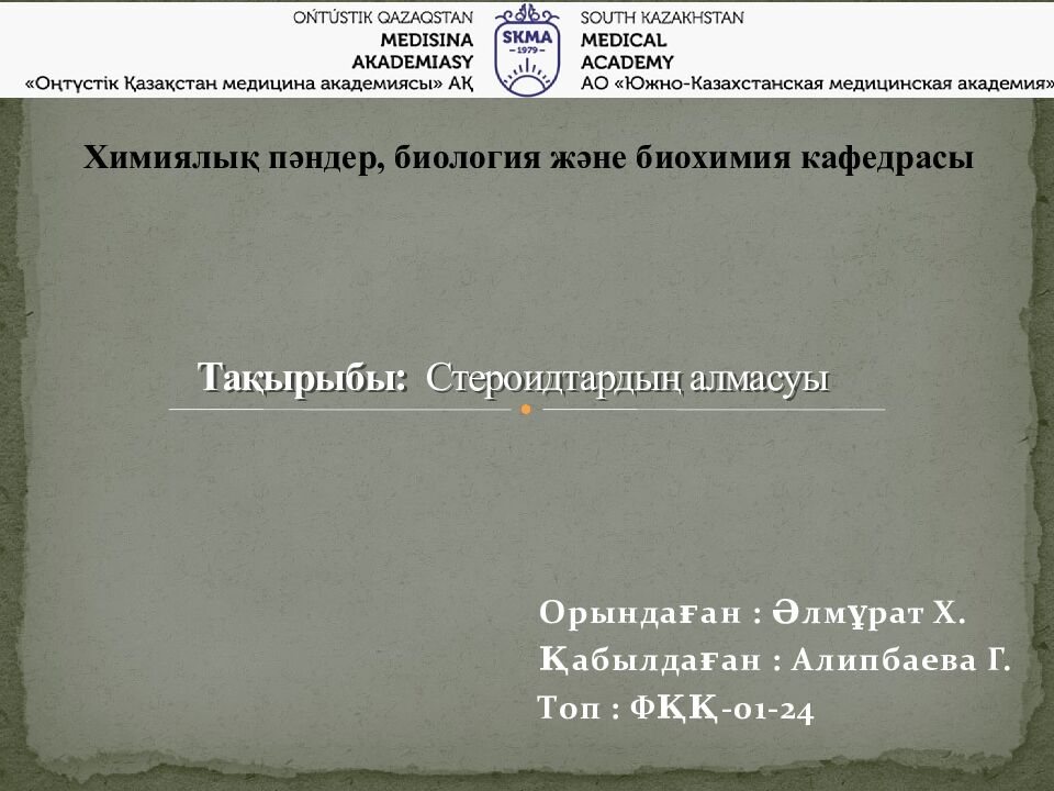 Орындаған : Әлмұрат Х. Қабылдаған : Алипбаева Г. Топ : ФҚҚ-01-24 Тақырыбы: Стероидтардың алмасуы Химиялық пәндер, биология және биохимия кафедрасы