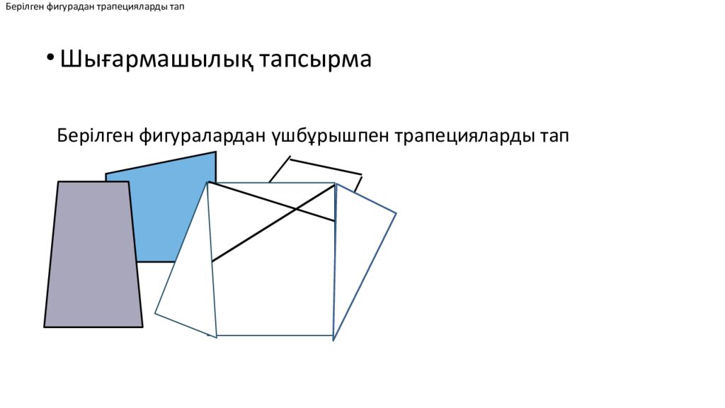 Шығармашылық тапсырма Берілген фигурадан трапецияларды тап Берілген фигуралардан үшбұрышпен трапецияларды тап