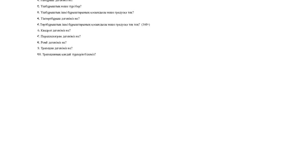 1.Үшбұрыш дегеніміз не? 2. Үшбұрыштың неше түрі бар? 3. Үшбұрыштың ішкі бұрыштарының қосындысы неше градусқа тең? 4. Тіктөртбұрыш дегеніміз не? 5.Төртбұрыштың ішкі бұрыштарының қосындысы неше градусқа тең тең? (360 0 ) 6. Квадрат дегеніміз не? 7. Параллелограм дегеніміз не? 8. Ромб дегеніміз не? 9. Трапеция дегеніміз не? 10. Трапецияның қандай түрлерін білеміз?