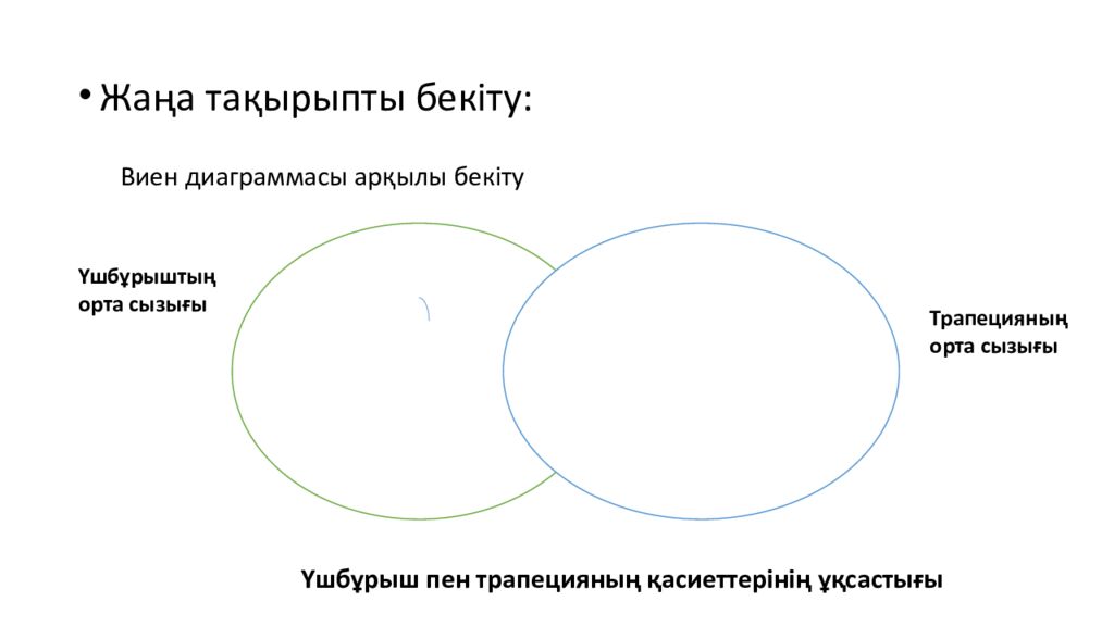 Жаңа тақырыпты бекіту: Виен диаграммасы арқылы бекіту Үшбұрыштың о рта сызығы Трапецияның орта сызығы Үшбұрыш пен трапецияның қасиеттерінің ұқсастығы