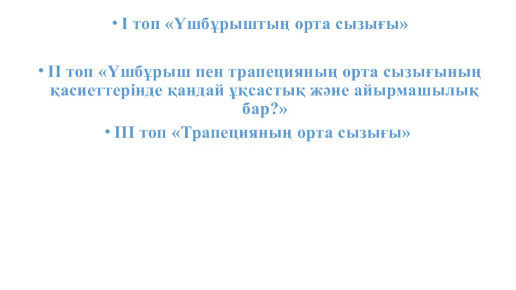 І топ «Үшбұрыштың орта сызығы » ІІ топ «Үшбұрыш пен трапецияның орта сызығының қасиеттерінде қандай ұқсастық және айырмашылық бар?» ІІІ топ «Трапецияның орта сызығы»