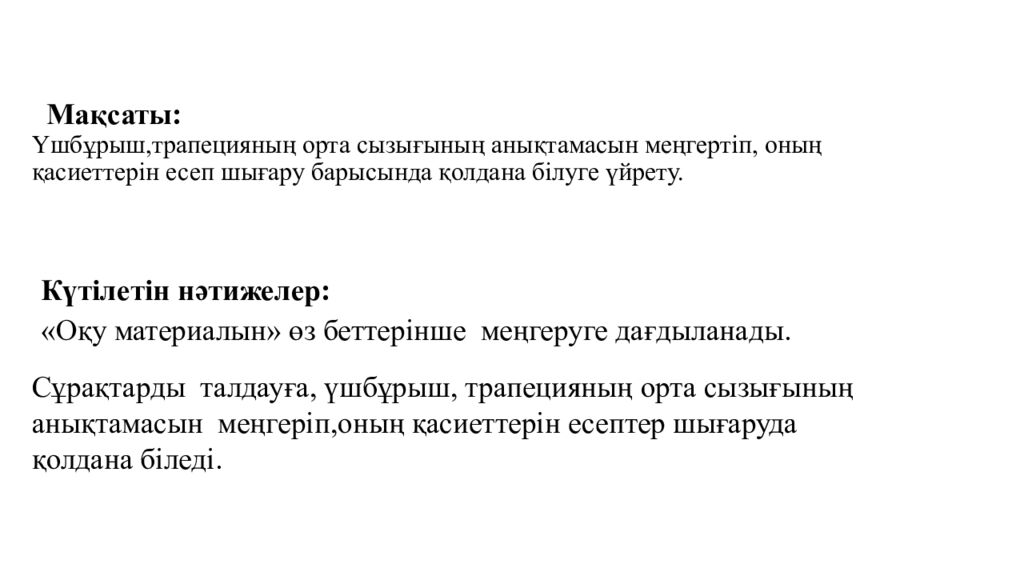 Күтілетін нәтижелер: «Оқу материалын» өз беттерінше меңгеруге дағдыланады. Сұрақтарды талдауға, үшбұрыш, трапецияның орта сызығының анықтамасын меңгеріп,оның қасиеттерін есептер шығаруда қолдана біледі.