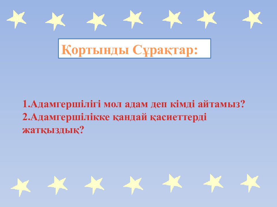 . Адамгершілігі мол адам деп кімді айтамыз? Адамгершілікке қандай қасиеттерді жатқыздық? Қортынды Сұрақтар: