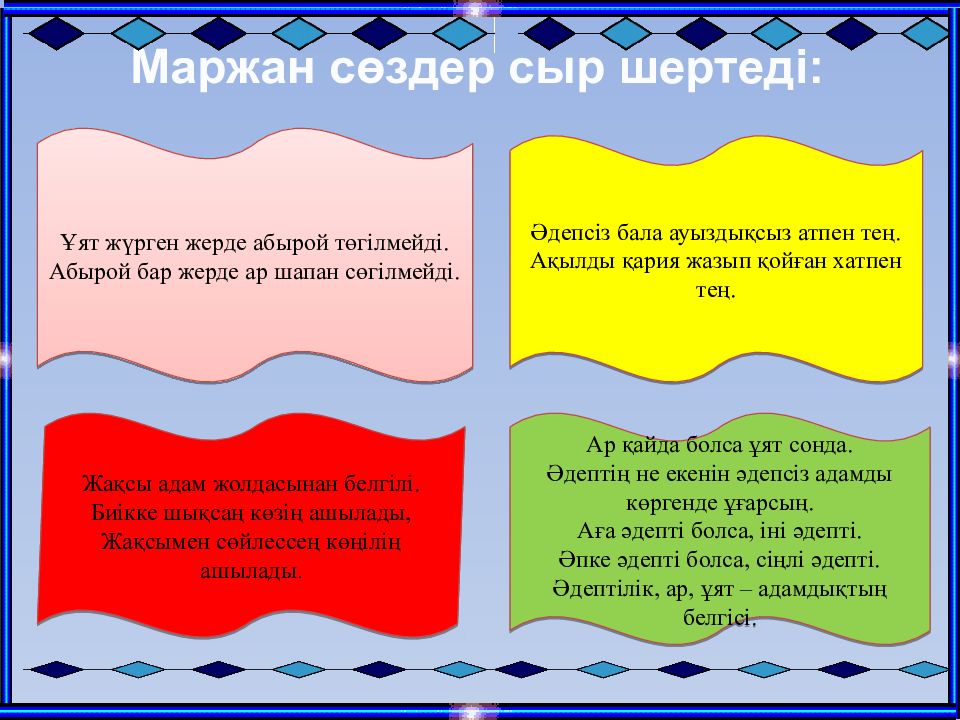 Маржан сөздер сыр шертеді: Жақсы адам жолдасынан белгілі. Биікке шықсаң көзің ашылады, Жақсымен сөйлессең көңілің ашылады. Ар қайда болса ұят сонда. Әдептің не екенін әдепсіз адамды көргенде ұғарсың. Аға әдепті болса, іні әдепті. Әпке әдепті болса, сіңлі әдепті. Әдептілік, ар, ұят – адамдықтың белгісі. Әдепсіз бала ауыздықсыз атпен тең. Ақылды қария жазып қойған хатпен тең. Ұят жүрген жерде абырой төгілмейді. Абырой бар жерде ар шапан сөгілмейді.