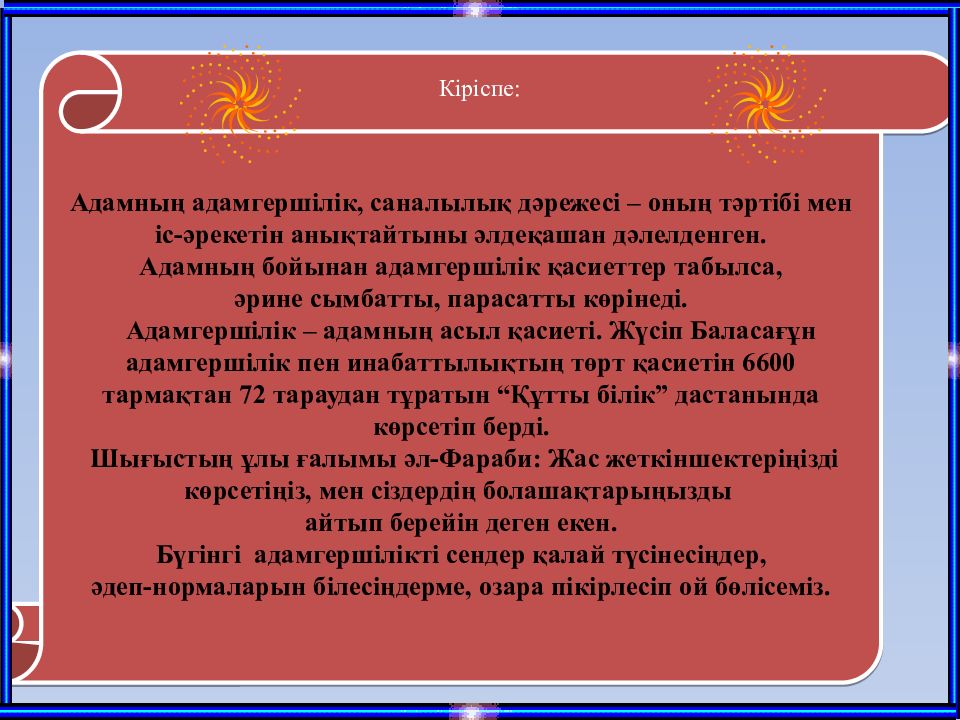 Кіріспе: Адамның адамгершілік, саналылық дәрежесі – оның тәртібі мен іс-әрекетін анықтайтыны әлдеқашан дәлелденген. Адамның бойынан адамгершілік қасиеттер табылса, әрине сымбатты, парасатты көрінеді. Адамгершілік – адамның асыл қасиеті. Жүсіп Баласағұн адамгершілік пен инабаттылықтың төрт қасиетін 6600 тармақтан 72 тараудан тұратын “Құтты білік” дастанында көрсетіп берді. Шығыстың ұлы ғалымы әл-Фараби: Жас жеткіншектеріңізді көрсетіңіз, мен сіздердің болашақтарыңызды айтып берейін деген екен. Бүгінгі адамгершілікті сендер қалай түсінесіңдер, әдеп-нормаларын білесіңдерме, озара пікірлесіп ой бөлісеміз.