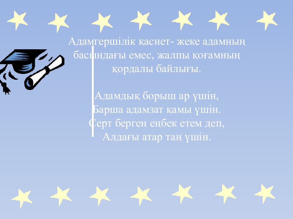 Адамгершілік қасиет- жеке адамның басындағы емес, жалпы қоғамның қордалы байлығы. Адамдық борыш ар үшін, Барша адамзат қамы үшін. Серт берген еңбек етем деп, Алдағы атар таң үшін.