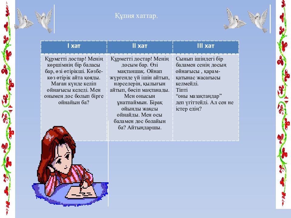 Құпия хаттар. І хат ІІ хат ІІІ хат Құрметті достар! Менің көршімнің бір баласы бар, өзі өтірікші. Көзбе-көз өтірік айта қояды. Маған күнде келіп ойнағысы келеді. Мен онымен дос болып бірге ойнайын ба? Құрметті достар! Менің досым бар. Өзі мақтаншақ. Ойнап жүргенде үй ішін айтып, нәрселерін, қылығын айтып, бөсіп мақтанады. Мен онысын ұнатпаймын. Бірақ ойынды жақсы ойнайды. Мен осы баламен дос болайын ба? Айтыңдаршы. Сынып ішіндегі бір баламен сенің досың ойнағысы, қарам-қатынас жасағысы келмейді. Тіпті “оны мазақтаңдар” деп үгіттейді. Ал сен не істер едің?