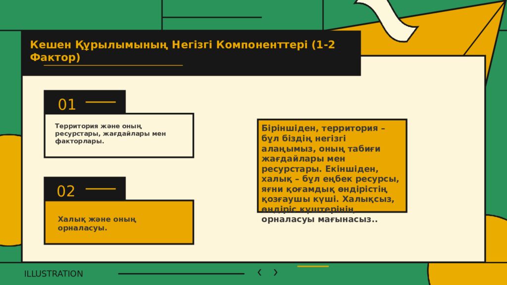 01 Территория және оның ресурстары, жағдайлары мен факторлары. 02 Халық және оның орналасуы. Біріншіден, территория – бұл біздің негізгі алаңымыз, оның табиғи жағдайлары мен ресурстары. Екіншіден, халық – бұл еңбек ресурсы, яғни қоғамдық өндірістің қозғаушы күші. Халықсыз, өндіріс күштерінің орналасуы мағынасыз.. ILLUSTRATION Кешен Құрылымының Негізгі Компоненттері (1-2 Фактор)
