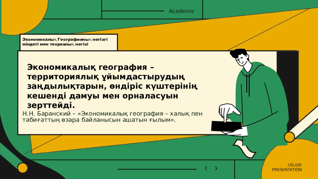 Н. Н. Баранский – « Экономикалық география – халық пен табиғаттың өзара байланысын ашатын ғылым ». Экономикалық Географияның н егізгі м індеті мен т еориялық н егізі //SLIDE PRESENTATION Academic Экономикалық география – территориялық ұйымдастырудың заңдылықтарын, өндіріс күштерінің кешенді дамуы мен орналасуын зерттейді.
