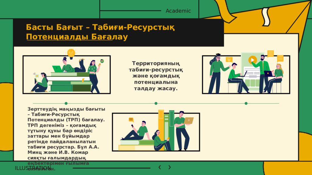 Зерттеудің маңызды бағыты – Табиғи - Ресурстық Потенциалды ( ТРП ) бағалау. ТРП дегеніміз – қоғамдық тұтыну құны бар өндіріс заттары мен бұйымдар ретінде пайдаланылатын табиғи ресурстар. Бұл А. А. Минц және И. В. Комар сияқты ғалымдардың еңбектерімен ғылымға енгізілген. Территорияның табиғи - ресурстық және қоғамдық потенциалына талдау жасау. ILLUSTRATION Academic Басты Бағыт – Табиғи - Ресурстық Потенциалды Бағалау