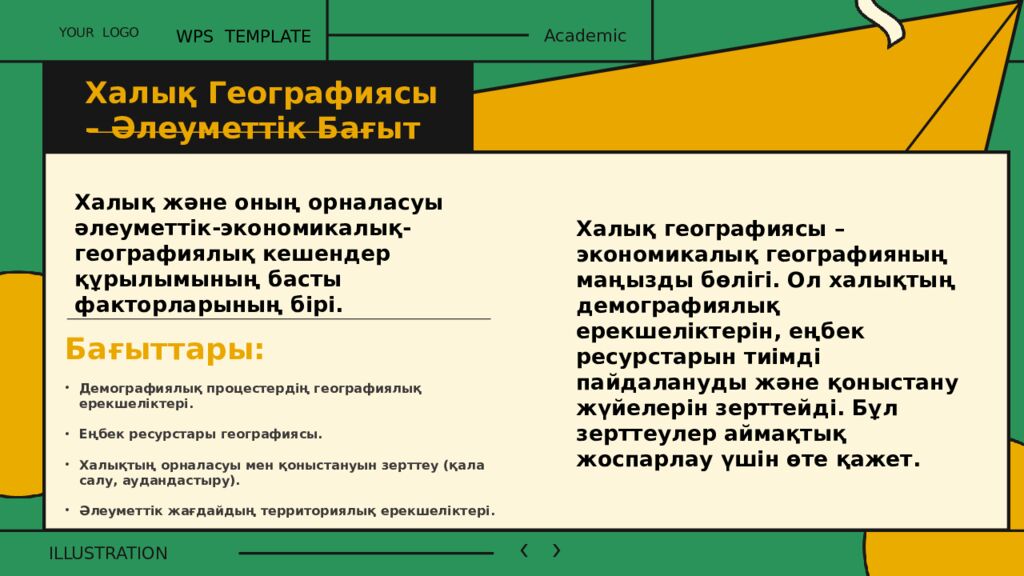 此处添加标题 Демографиялық процестердің географиялық ерекшеліктері. Еңбек ресурстары географиясы. Халықтың орналасуы мен қоныстануын зерттеу ( қала салу, аудандастыру ). Әлеуметтік жағдайдың территориялық ерекшеліктері. Бағыттары : YOUR LOGO ILLUSTRATION WPS TEMPLATE Academic Халық Географиясы – Әлеуметтік Бағыт Халық және оның орналасуы әлеуметтік-экономикалық-географиялық кешендер құрылымының басты факторларының бірі. Халық географиясы – экономикалық географияның маңызды бөлігі. Ол халықтың демографиялық ерекшеліктерін, еңбек ресурстарын тиімді пайдалануды және қоныстану жүйелерін зерттейді. Бұл зерттеулер аймақтық жоспарлау үшін өте қажет.