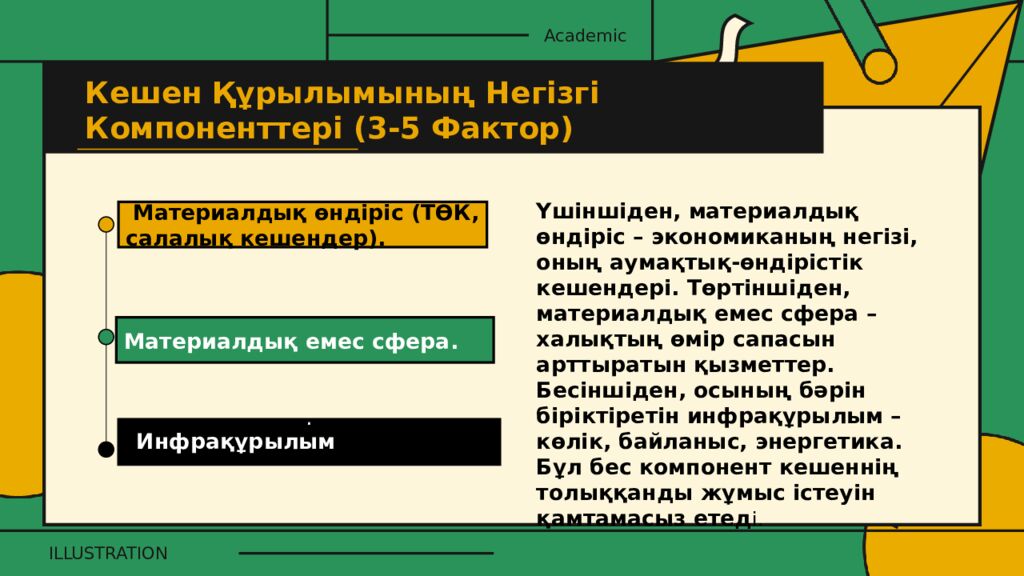 Материалдық өндіріс ( ТӨК, салалық кешендер ). Материалдық емес сфера. . ILLUSTRATION Academic Кешен Құрылымының Негізгі Компоненттері (3-5 Фактор ) Үшіншіден, материалдық өндіріс – экономиканың негізі, оның аумақтық - өндірістік кешендері. Төртіншіден, материалдық емес сфера – халықтың өмір сапасын арттыратын қызметтер. Бесіншіден, осының бәрін біріктіретін инфрақұрылым – көлік, байланыс, энергетика. Бұл бес компонент кешеннің толыққанды жұмыс істеуін қамтамасыз етед і. Инфрақұрылым
