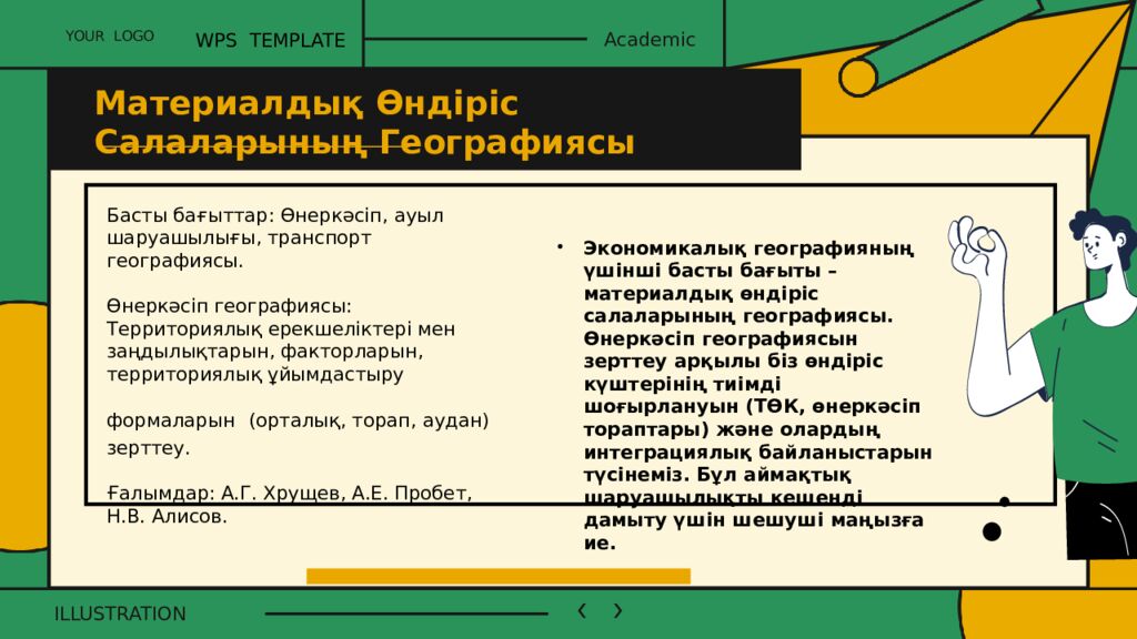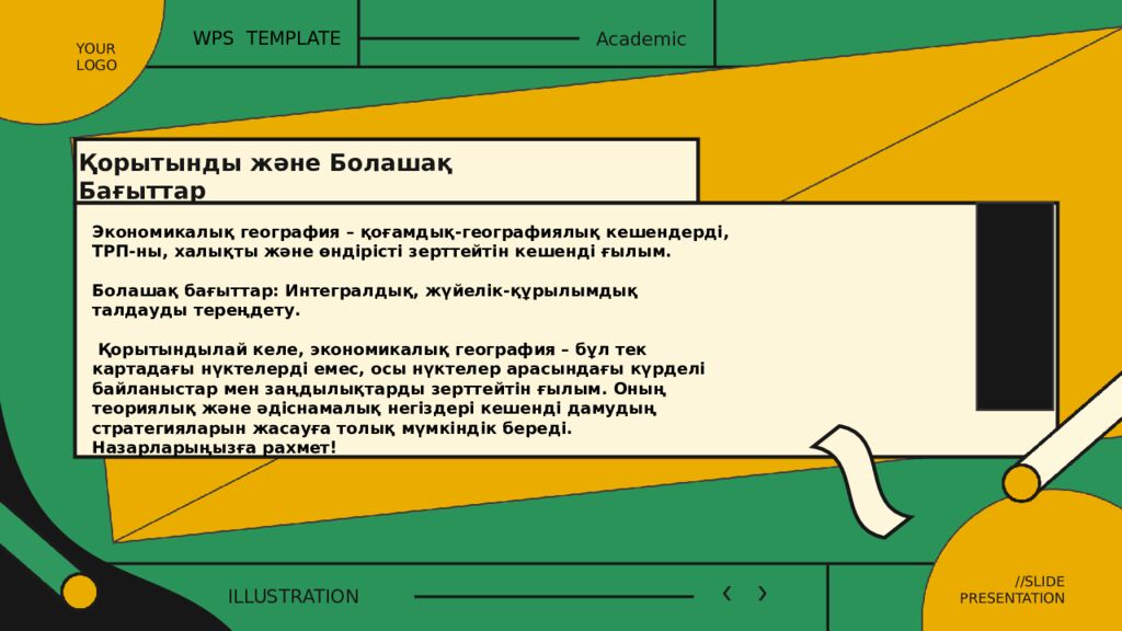 YOUR LOGO Academic Қорытынды және Болашақ Бағыттар Экономикалық география – қоғамдық - географиялық кешендерді, ТРП - ны, халықты және өндірісті зерттейтін кешенді ғылым. Болашақ бағыттар : Интегралдық, жүйелік - құрылымдық талдауды тереңдету. Қорытындылай келе, экономикалық география – бұл тек картадағы нүктелерді емес, осы нүктелер арасындағы күрделі байланыстар мен заңдылықтарды зерттейтін ғылым. Оның теориялық және әдіснамалық негіздері кешенді дамудың стратегияларын жасауға толық мүмкіндік береді. Назарларыңызға рахмет ! //SLIDE PRESENTATION ILLUSTRATION WPS TEMPLATE
