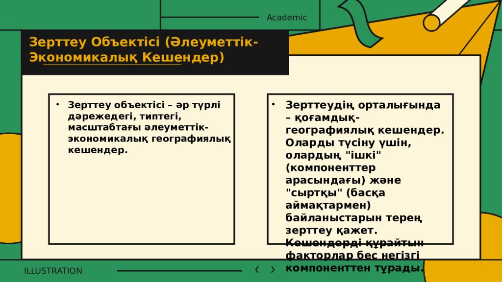 Зерттеу объектісі – әр түрлі дәрежедегі, типтегі, масштабтағы әлеуметтік - экономикалық географиялық кешендер. Зерттеудің орталығында – қоғамдық - географиялық кешендер. Оларды түсіну үшін, олардың " ішкі " ( компоненттер арасындағы ) және " сыртқы " ( басқа аймақтармен ) байланыстарын терең зерттеу қажет. Кешендерді құрайтын факторлар бес негізгі компоненттен тұрады. ILLUSTRATION Academic Зерттеу Объектісі ( Әлеуметтік - Экономикалық Кешендер )