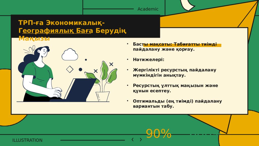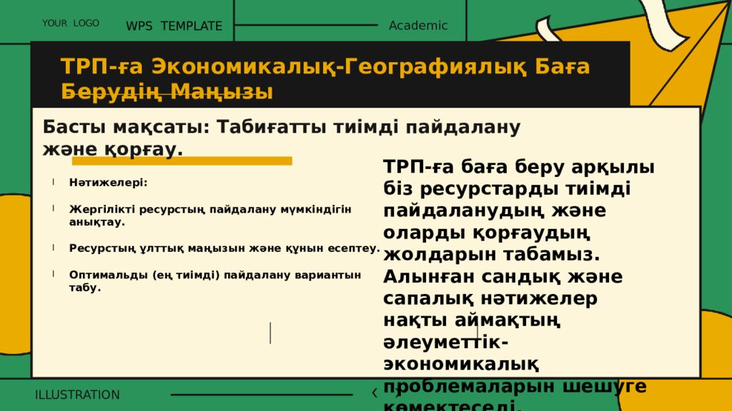 Нәтижелері : Жергілікті ресурстың пайдалану мүмкіндігін анықтау. Ресурстың ұлттық маңызын және құнын есептеу. Оптимальды ( ең тиімді ) пайдалану вариантын табу. Басты мақсаты : Табиғатты тиімді пайдалану және қорғау. YOUR LOGO ILLUSTRATION WPS TEMPLATE Academic ТРП - ға Экономикалық - Географиялық Баға Берудің Маңызы ТРП - ға баға беру арқылы біз ресурстарды тиімді пайдаланудың және оларды қорғаудың жолдарын табамыз. Алынған сандық және сапалық нәтижелер нақты аймақтың әлеуметтік - экономикалық проблемаларын шешуге көмектеседі.
