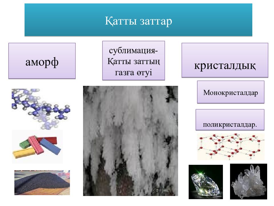 аморф кристалдық поликристалдар. сублимация- Қатты заттың газға өтуі Қатты заттар Монокристалдар