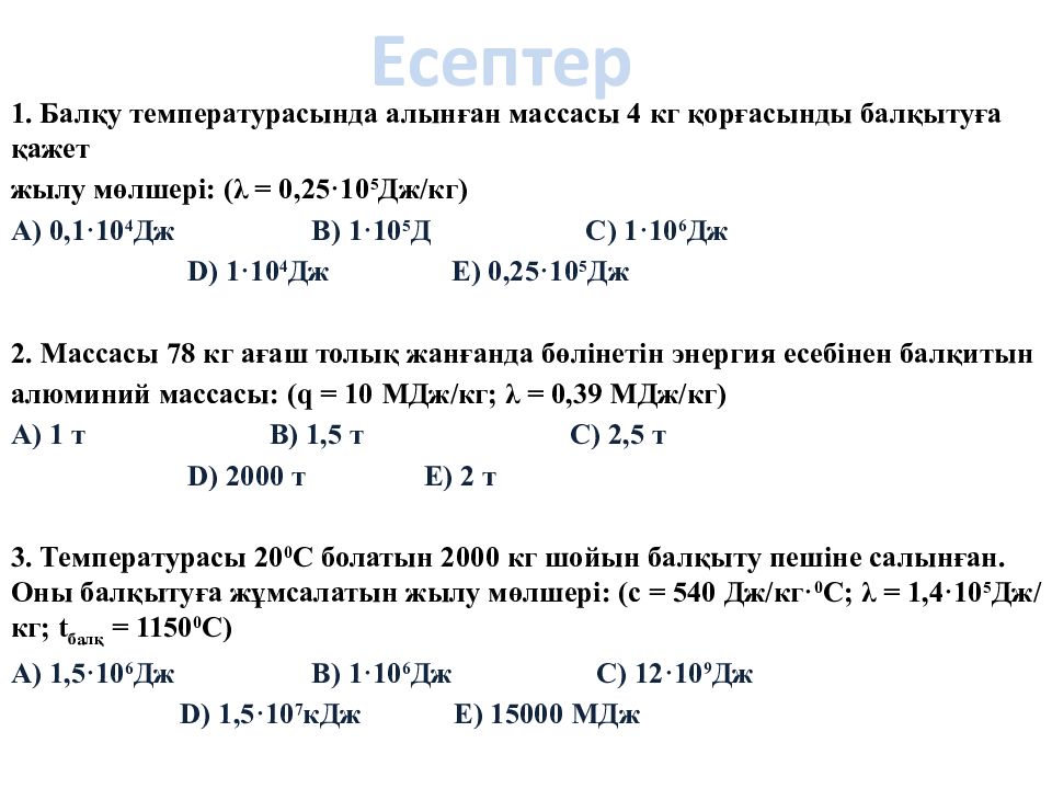 1. Балқу температурасында алы н ған массасы 4 кг қорғасынды балқытуға қажет жылу мөлшері : (λ = 0,25·10 5 Дж / кг ) А) 0,1·10 4 Дж В) 1·10 5 Д С) 1·10 6 Дж D ) 1·10 4 Дж E ) 0,25·10 5 Дж 2. Массасы 78 кг ағаш толық жанғанда бөлінетін энергия есебінен балқитын алюминий массасы : ( q = 10 МДж/кг; λ = 0,39 МДж/кг) A) 1 т B) 1,5 т C) 2,5 т D) 2000 т E) 2 т 3. Температурасы 20 0 С болатын 2000 кг шойын балқыту пешіне салынған. Оны балқытуға жұмсалатын жылу мөлшері : (с = 540 Дж/кг· 0 С; λ = 1,4·10 5 Дж/кг; t балқ = 1150 0 С) A ) 1,5·10 6 Дж B ) 1·10 6 Дж C ) 12·10 9 Дж D ) 1,5·10 7 кДж E ) 15000 МДж Есептер