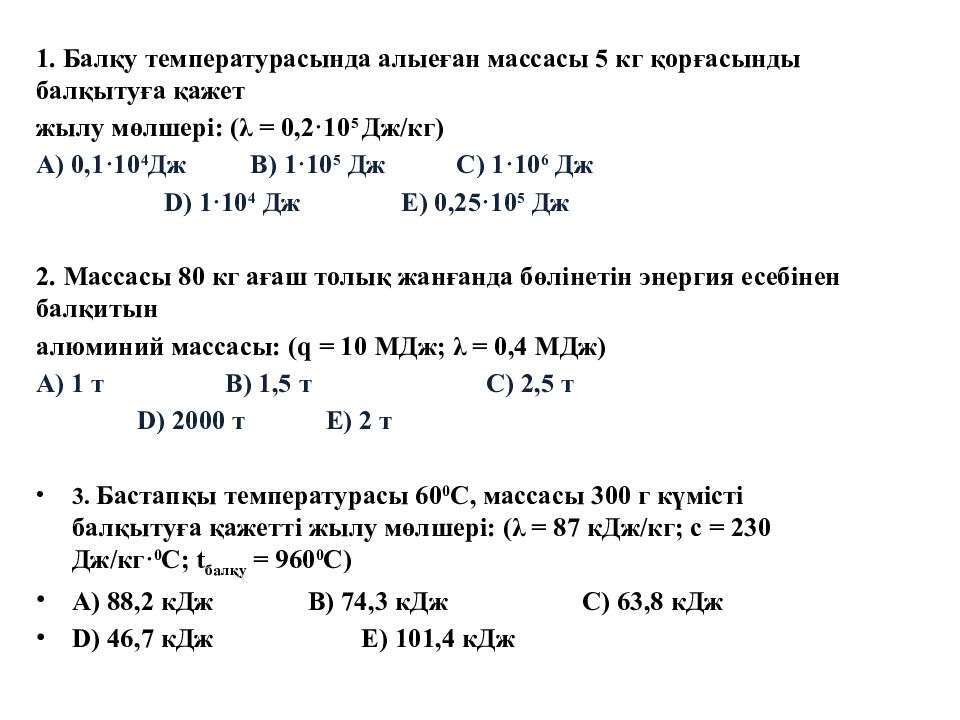 1. Балқу температурасында алыеған массасы 5 кг қорғасынды балқытуға қажет жылу мөлшері: (λ = 0,2·10 5 Дж/кг) А) 0,1·10 4 Дж В) 1·10 5 Дж С) 1·10 6 Дж D) 1·10 4 Дж E) 0,25·10 5 Дж 2. Массасы 80 кг ағаш толық жанғанда бөлінетін энергия есебінен балқитын алюминий массасы: (q = 10 МДж; λ = 0,4 МДж) A) 1 т B) 1,5 т C) 2,5 т D) 2000 т E) 2 т 3. Бастапқы температурасы 60 0 С, массасы 300 г күмісті балқытуға қажетті жылу мөлшері: (λ = 87 кДж/кг; с = 230 Дж/кг· 0 С; t балқу = 960 0 С) A) 88,2 кДж B) 74,3 кДж C) 63,8 кДж D) 46,7 кДж E) 101,4 кДж