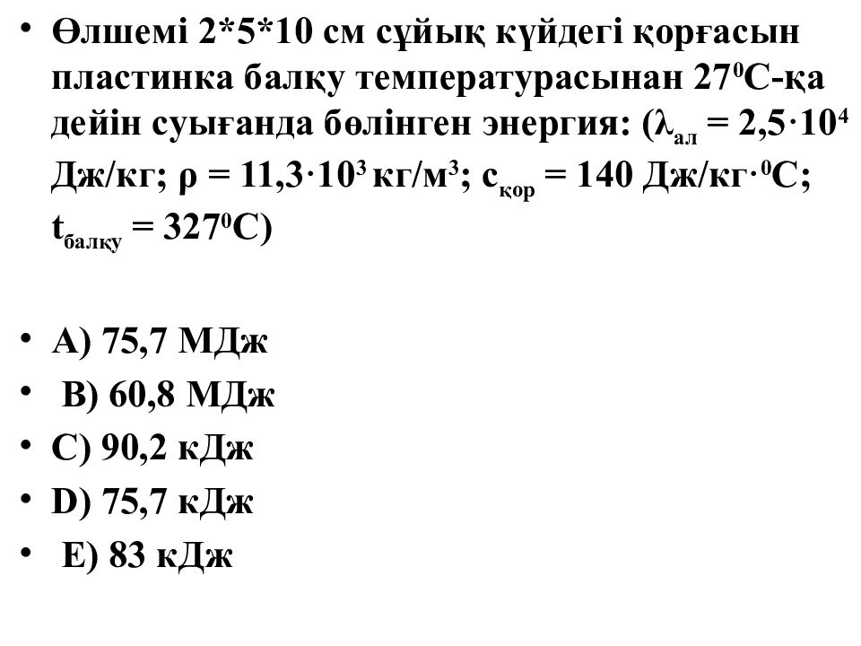 Өлшемі 2*5*10 см сұйық күйдегі қорғасын пластинка балқу температурасынан 27 0 С - қа дейін суығанда бөлінген энергия : (λ ал = 2,5·10 4 Дж / кг ; ρ = 11,3·10 3 кг / м 3 ; c қор = 140 Дж / кг · 0 С ; t балқу = 327 0 С ) A) 75,7 МДж B) 60,8 МДж C) 90,2 кДж D) 75,7 кДж E) 83 кДж