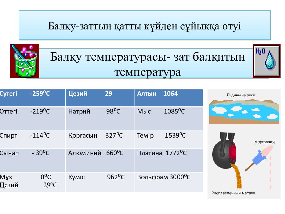 Балқу-заттың қатты күйден сұйыққа өтуі Балқу температурасы- зат балқитын температура Сутегі -259⁰С Цезий 29 Алтын 1064 Оттегі -219 ⁰С Натрий 98 ⁰С Мыс 1085 ⁰С Спирт -114 ⁰С Қорғасын 327⁰С Темір 1539 ⁰С Сынап - 39 ⁰С Алюминий 660 ⁰С Платина 1772 ⁰С Мұз 0 ⁰С Цезий 29⁰С Күміс 962 ⁰С Вольфрам 3000 ⁰С