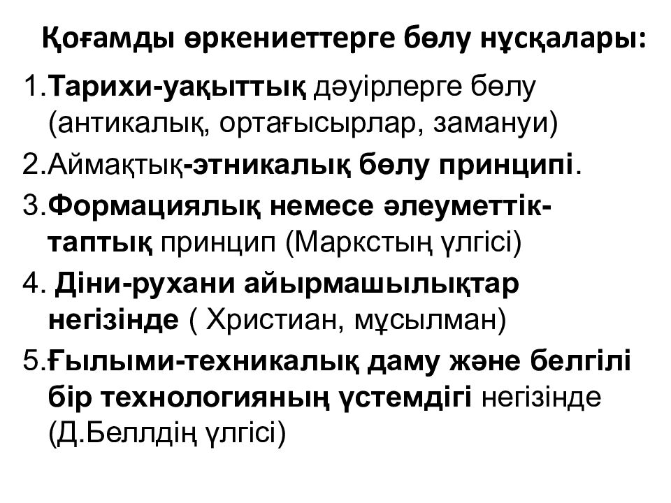 1. Тарихи-уақыттық дәуірлерге бөлу ( антикалық, ортағысырлар, замануи ) 2.Аймақтық -этникалық бөлу принципі. 3. Формациялық немесе әлеуметтік-таптық принцип ( Маркстың үлгісі ) 4. Діни-рухани айырмашылықтар негізінде ( Христиан, мұсылман ) 5. Ғылыми-техникалық даму және белгілі бір технологияның үстемдігі негізінде ( Д.Беллдің үлгісі )