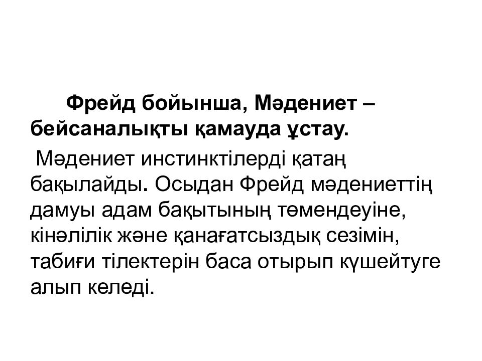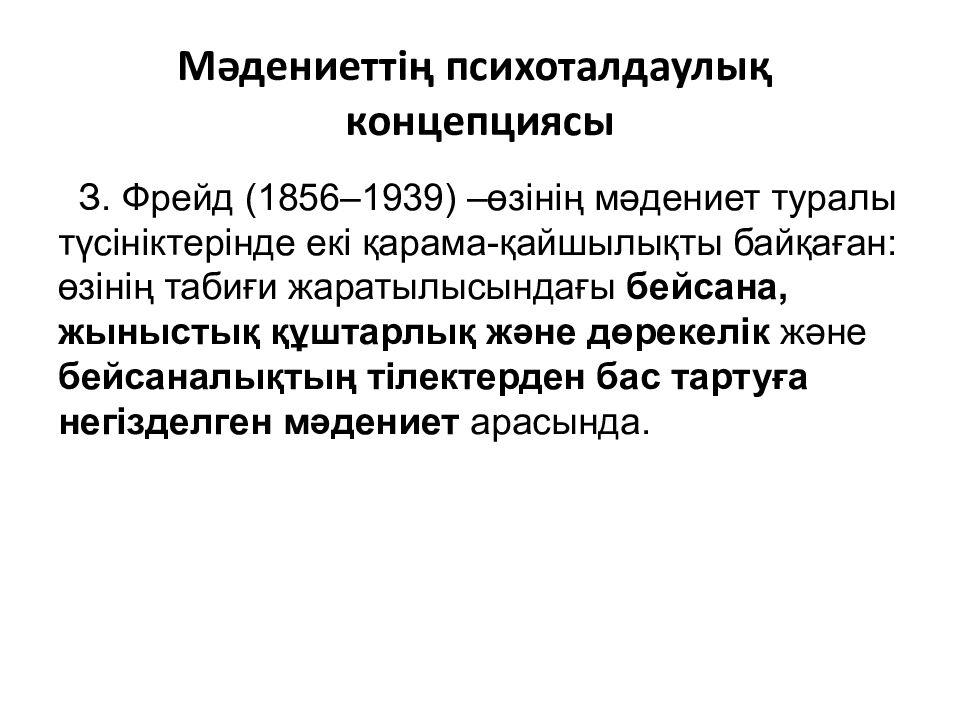 З. Фрейд (1856–1939 ) – өзінің мәдениет туралы түсініктерінде екі қарама-қайшылықты байқаған : өзінің табиғи жаратылысындағы бейсана, жыныстық құштарлық және дөрекелік және бейсаналықтың тілектерден бас тартуға негізделген мәдениет арасында.