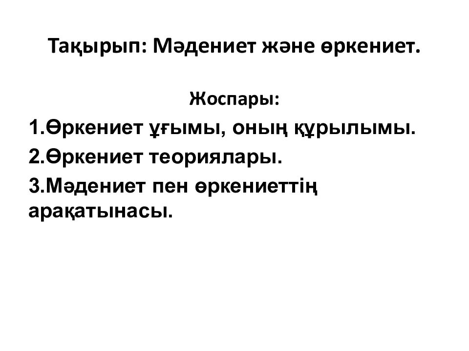 Жоспары : 1.Өркениет ұғымы, оның құрылымы. 2.Өркениет теориялары. 3.Мәдениет пен өркениеттің арақатынасы.