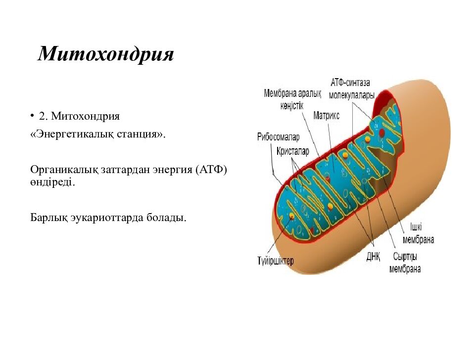 2. Митохондрия « Энергетикалық станция». Органикалық заттардан энергия (АТФ) өндіреді. Барлық эукариоттарда болады.