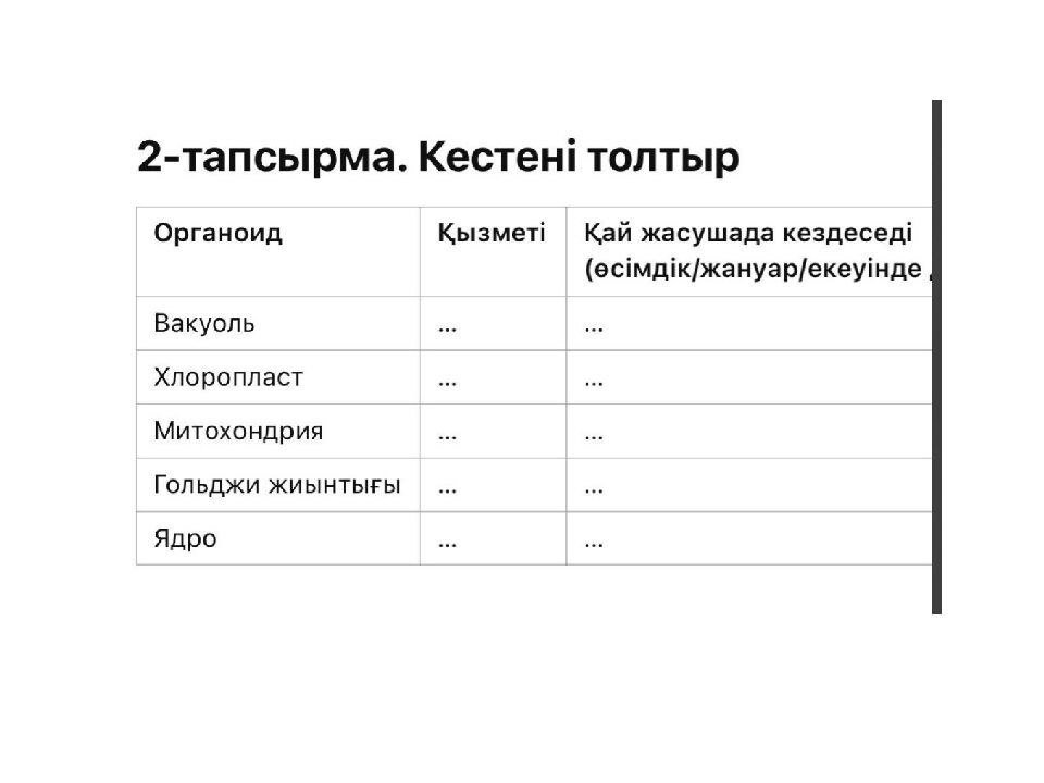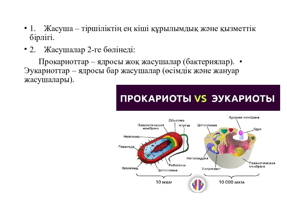 1. Жасуша – тіршіліктің ең кіші құрылымдық және қызметтік бірлігі. 2. Жасушалар 2-ге бөлінеді: Прокариоттар – ядросы жоқ жасушалар (бактериялар). • Эукариоттар – ядросы бар жасушалар (өсімдік және жануар жасушалары).