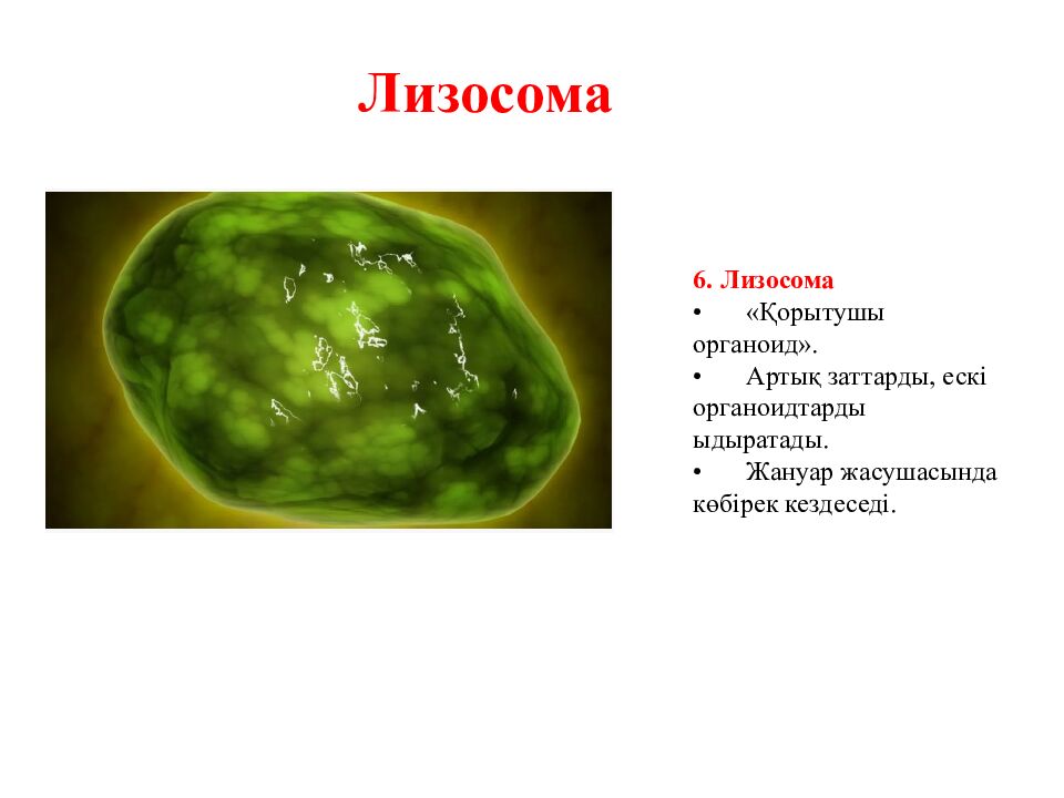 Лизосома 6. Лизосома • «Қорытушы органоид». • Артық заттарды, ескі органоидтарды ыдыратады. • Жануар жасушасында көбірек кездеседі.