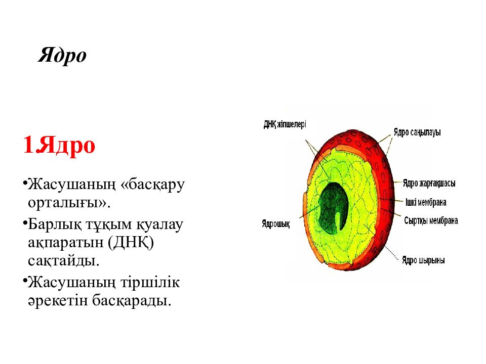 Ядро Жасушаның «басқару орталығы ». Барлық тұқым қуалау ақпаратын (ДНҚ) сақтайды. Жасушаның тіршілік әрекетін басқарады.