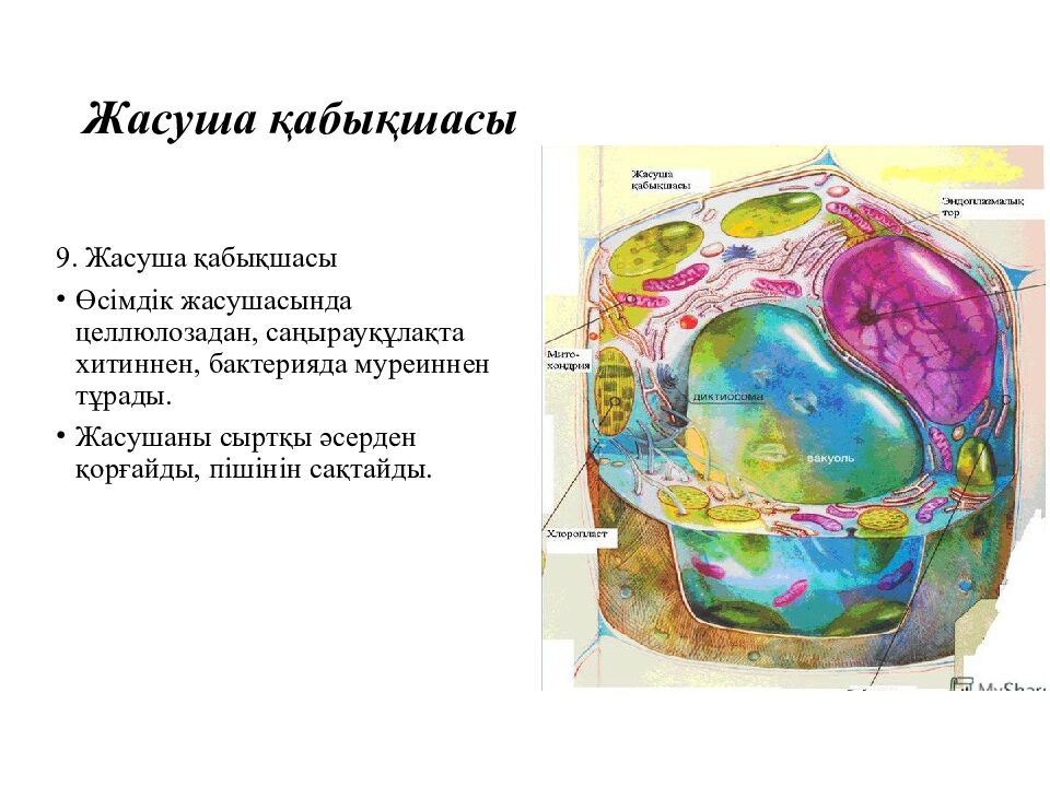9. Жасуша қабықшасы Өсімдік жасушасында целлюлозадан, саңырауқұлақта хитиннен, бактерияда муреиннен тұрады. Жасушаны сыртқы әсерден қорғайды, пішінін сақтайды.