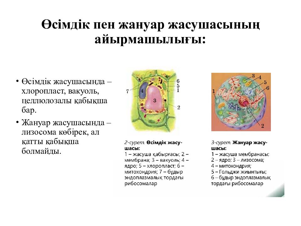 Өсімдік жасушасында – хлоропласт, вакуоль, целлюлозалы қабықша бар. Жануар жасушасында – лизосома көбірек, ал қатты қабықша болмайды.