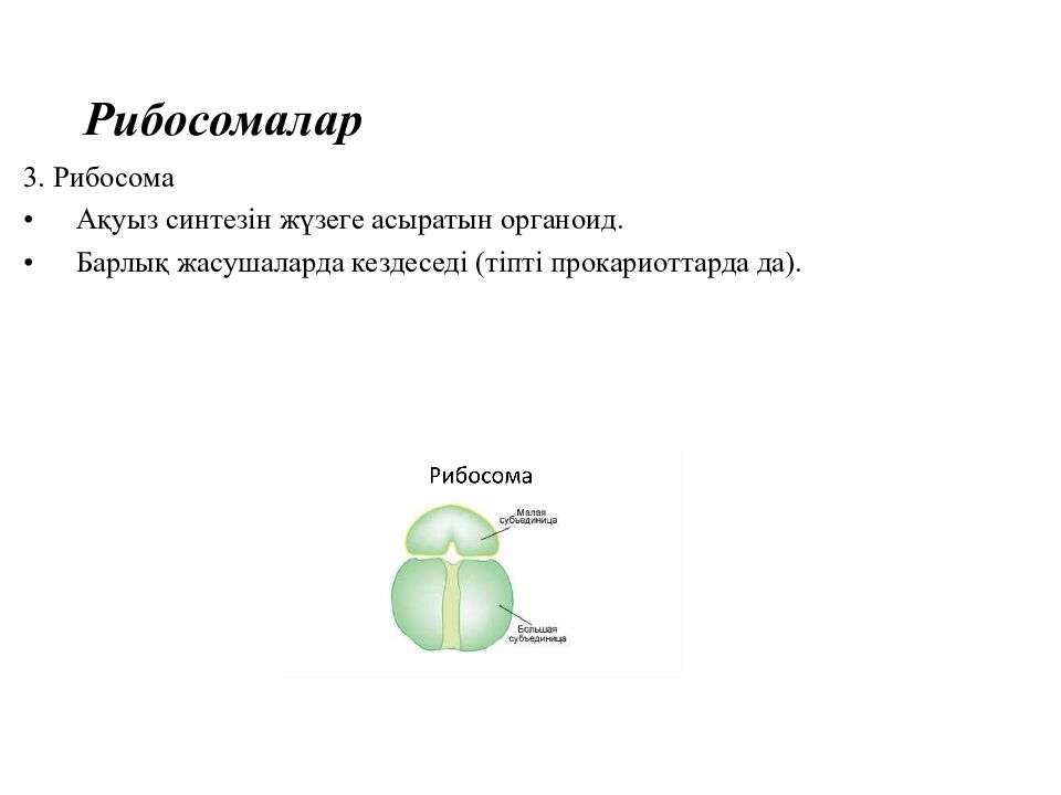 3. Рибосома • Ақуыз синтезін жүзеге асыратын органоид. • Барлық жасушаларда кездеседі (тіпті прокариоттарда да).