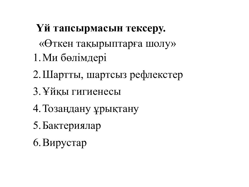 Үй тапсырмасын тексеру. «Өткен тақырыптарға шолу» Ми бөлімдері Шартты, шартсыз рефлекстер Ұйқы гигиенесы Тозаңдану ұрықтану Бактериялар Вирустар