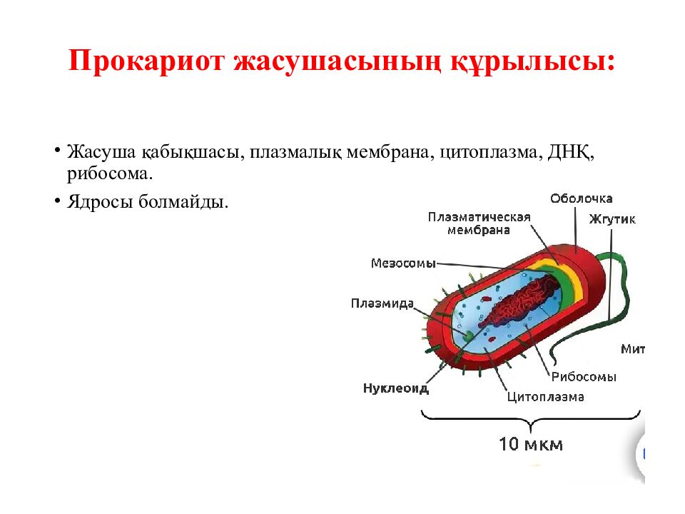 Жасуша қабықшасы, плазмалық мембрана, цитоплазма, ДНҚ, рибосома. Ядросы болмайды.
