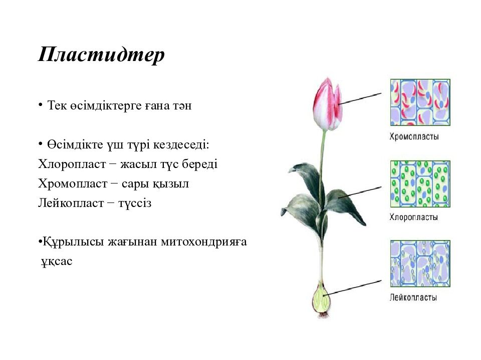 Тек өсімдіктерге ғана тән Өсімдікте үш түрі кездеседі: Хлоропласт − жасыл түс береді Хромопласт − сары қызыл Лейкопласт − түссіз •Құрылысы жағынан митохондрияға ұқсас