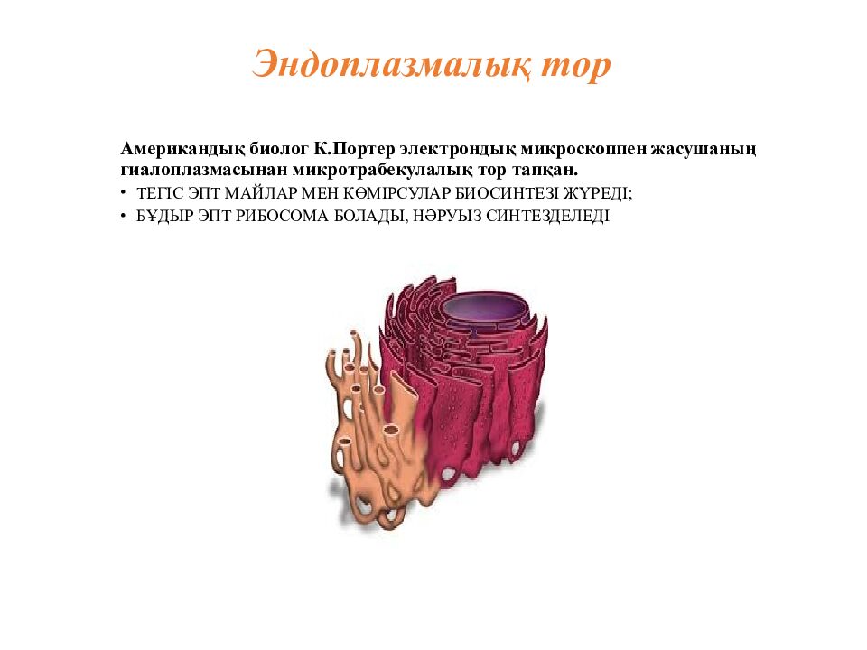 Американдық биолог К.Портер электрондық микроскоппен жасушаның гиалоплазмасынан микротрабекулалық тор тапқан. ТЕГІС ЭПТ МАЙЛАР МЕН КӨМІРСУЛАР БИОСИНТЕЗІ ЖҮРЕДІ; БҰДЫР ЭПТ РИБОСОМА БОЛАДЫ, НӘРУЫЗ СИНТЕЗДЕЛЕДІ
